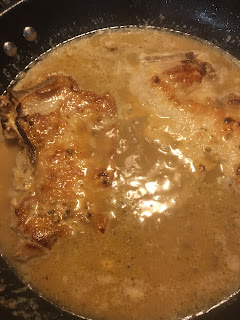 Paisto runsaassa, mutta ei ylettömässä määrässä luomuvoita muutaman minuutin puoleltaan. Sen jälkeen kastikkeessa hautumaan. Kastike olisi luontevinta tehdä kermasta, jonka tietenkin unohdin ostaa. Maitopurkin parasta ennen päiväys ei jättänyt edes koemaistamisoptiota, joten liemi oli valmistettava mantelimaidosta ja siihen lisätystä vedestä. Koska mantelimaito on hoikka aine kuohukerman rinnalla, niin voita voisi ehkä kompensoivasti lisätä. En kuitenkaan tehnyt niin, sillä paistorasva ja lihoista irronnut neste oli pannussa jäljellä. Mausteeksi soijaöljyä, huhmareessa murskattuja viherpippureita, suolaa, lihaliemikuutio ja ripaus suolaa. Suurustus tummalla maissitärkkelyksellä.